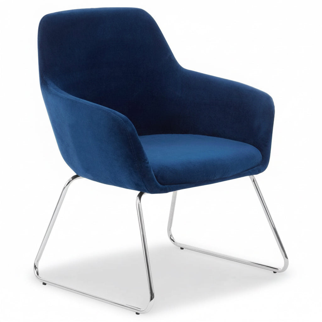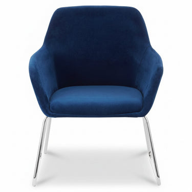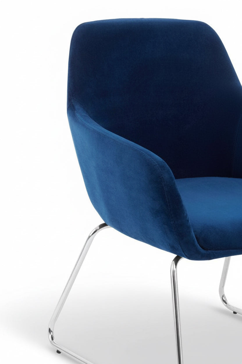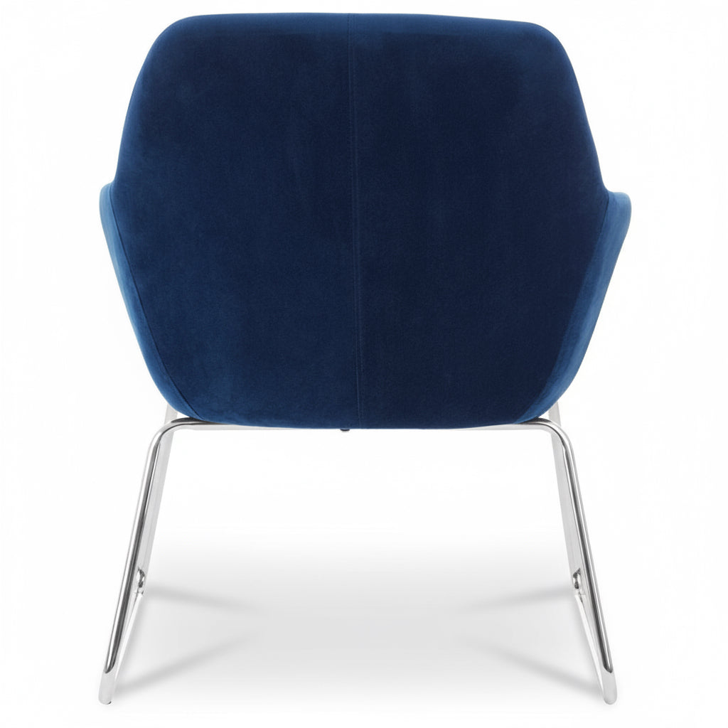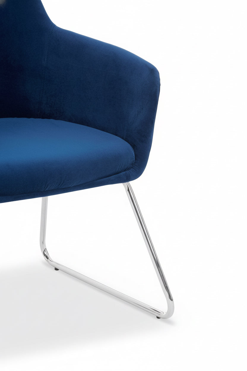 The blue velvet Storvorde Armchair brings effortless sophistication to any interior. Upholstered in smooth blue velvet, its seamless silhouette features a square seat, flared arms, and a gently rounded back for a balanced, contemporary look. Resting on sleek, splayed chrome legs, this chair captures modern luxury with a hint of mid-century charm — perfect for elevating your living or dressing space with understated style.