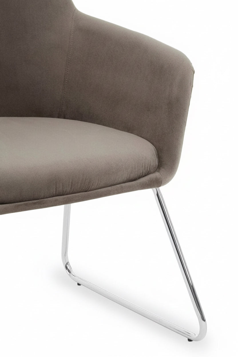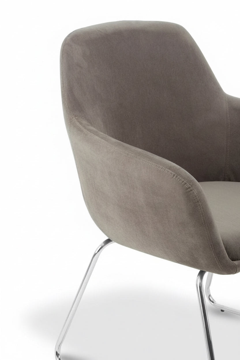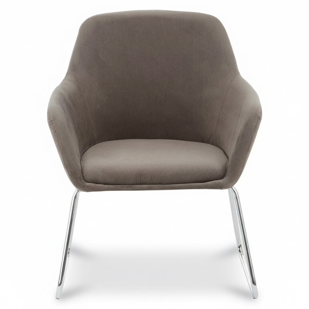 The Grey Velvet Storvorde Armchair brings effortless sophistication to any interior. Upholstered in smooth grey velvet, its seamless silhouette features a square seat, flared arms, and a gently rounded back for a balanced, contemporary look. Resting on sleek, splayed chrome legs, this chair captures modern luxury with a hint of mid-century charm — perfect for elevating your living or dressing space with understated style.
