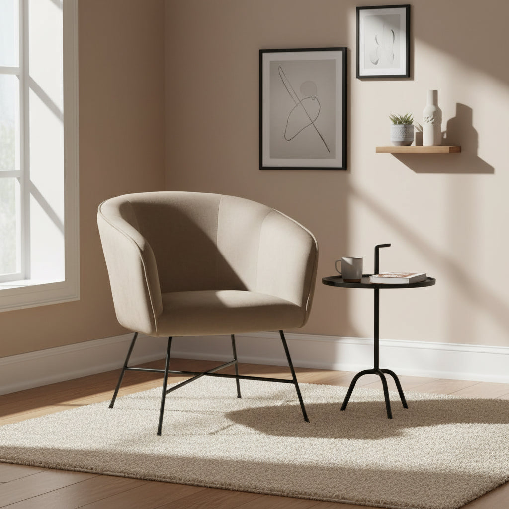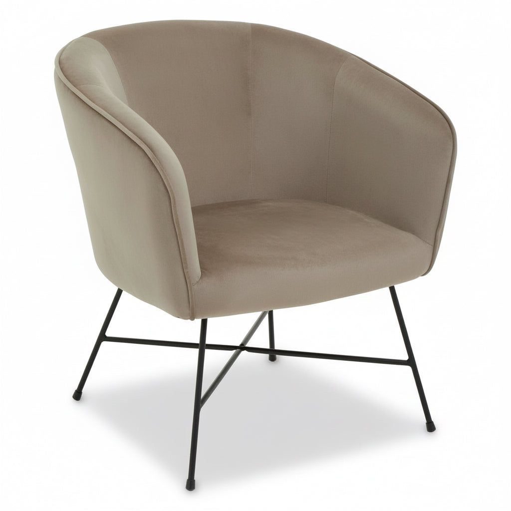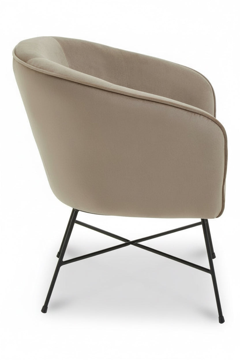 The Storvorde Tub Chair embodies understated luxury with its mink velvet upholstery and sculptural silhouette. Designed with ergonomic armrests and a foam-padded seat, it offers both comfort and style. The sleek black angular metal base provides a modern contrast, adding strength and sophistication. Perfectly balancing form and function, this chair enhances any contemporary space with effortless charm.