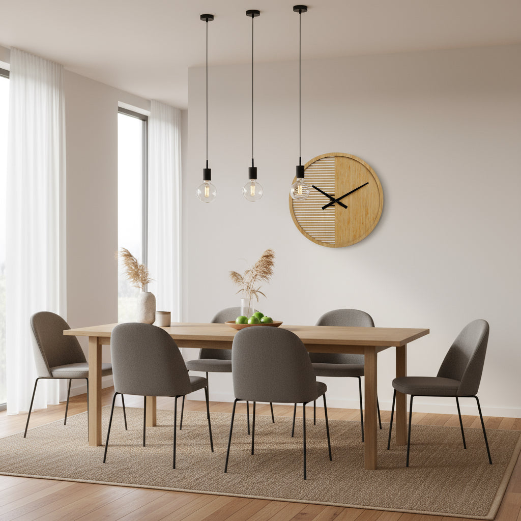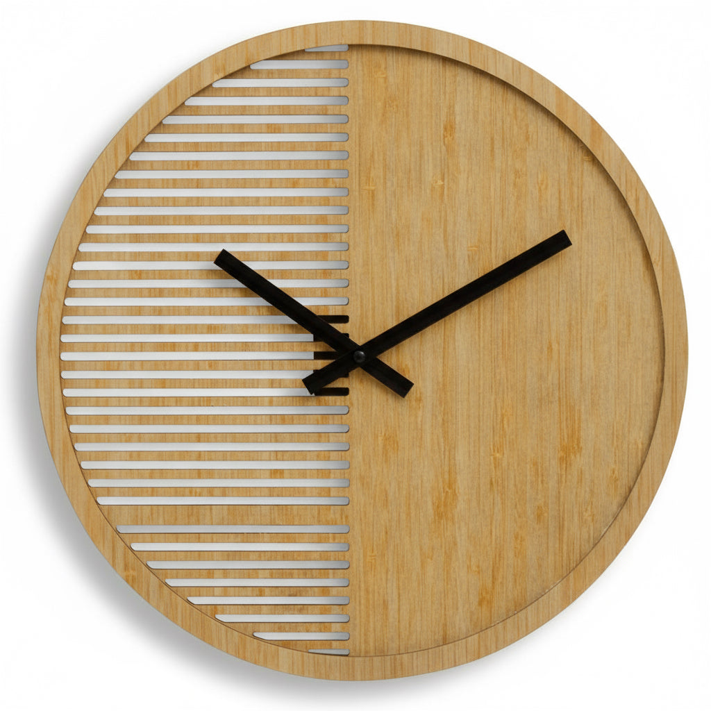 The Vattern Wood Effect Wall Clock is a statement in modern simplicity and texture. Its asymmetrical wood-effect dial combines smooth natural tones with sleek horizontal cutouts, creating depth and visual balance. Bold black hands stand out against the warm grain finish, bringing clarity and contrast. Designed to complement modern, Scandinavian, and bohemian-inspired interiors, this clock blends organic warmth with clean contemporary style.