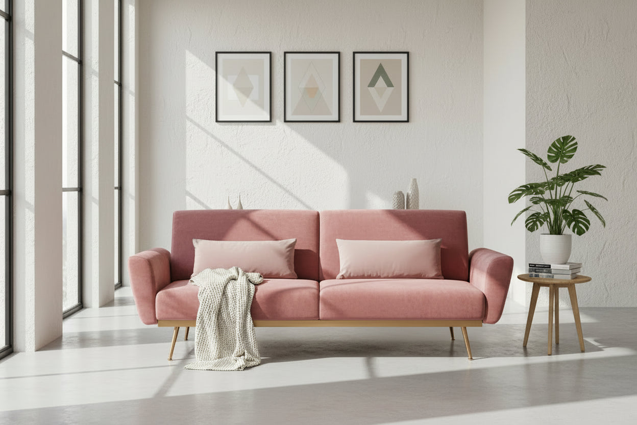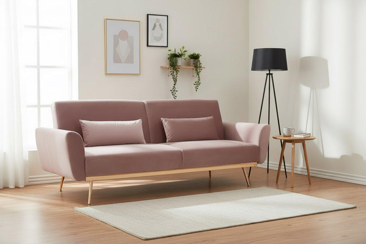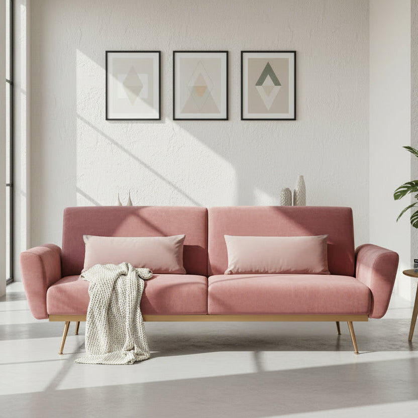 Elevate your living space with this beautifully crafted pink velvet sofa bed—where comfort meets contemporary boho style. Designed with wavy springs and plush foam padding, it offers an exceptionally supportive seating experience. The angular backrest seamlessly lowers to transform the sofa into a cosy bed, perfect for overnight guests or relaxed lounging.
