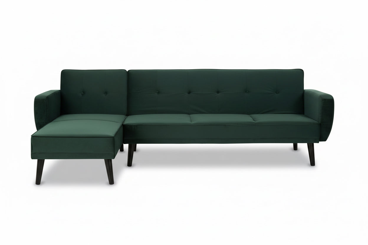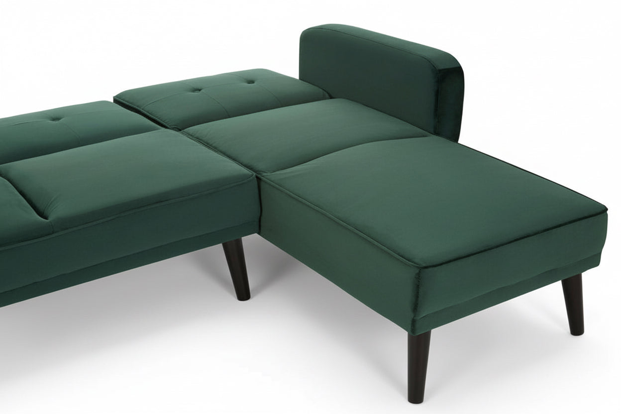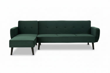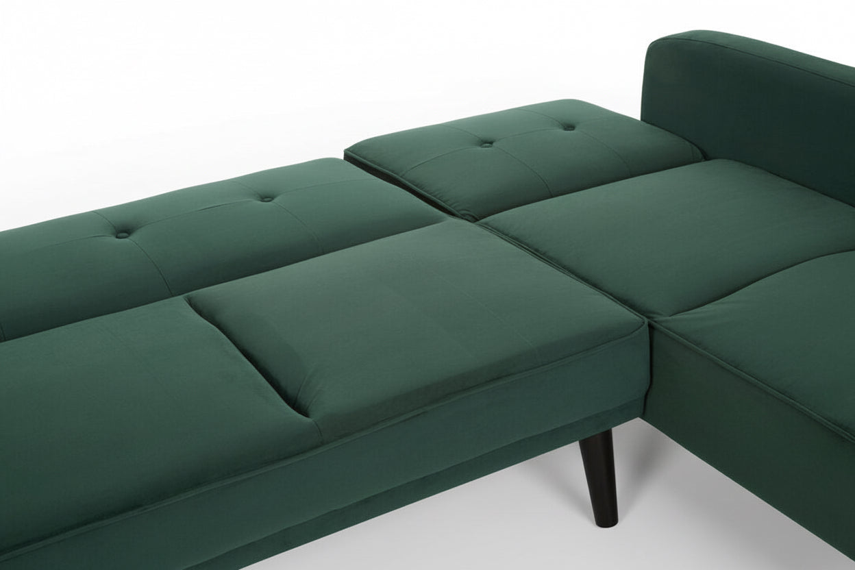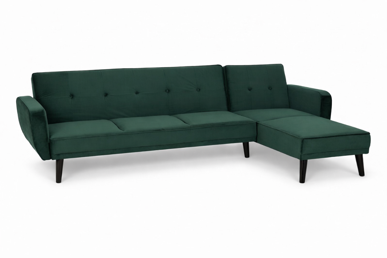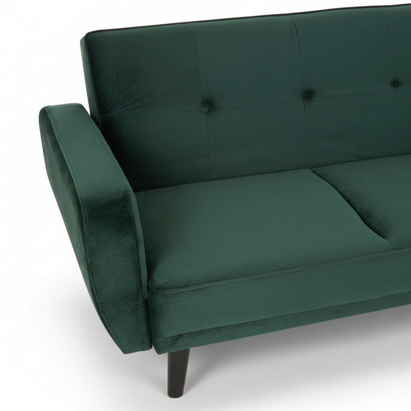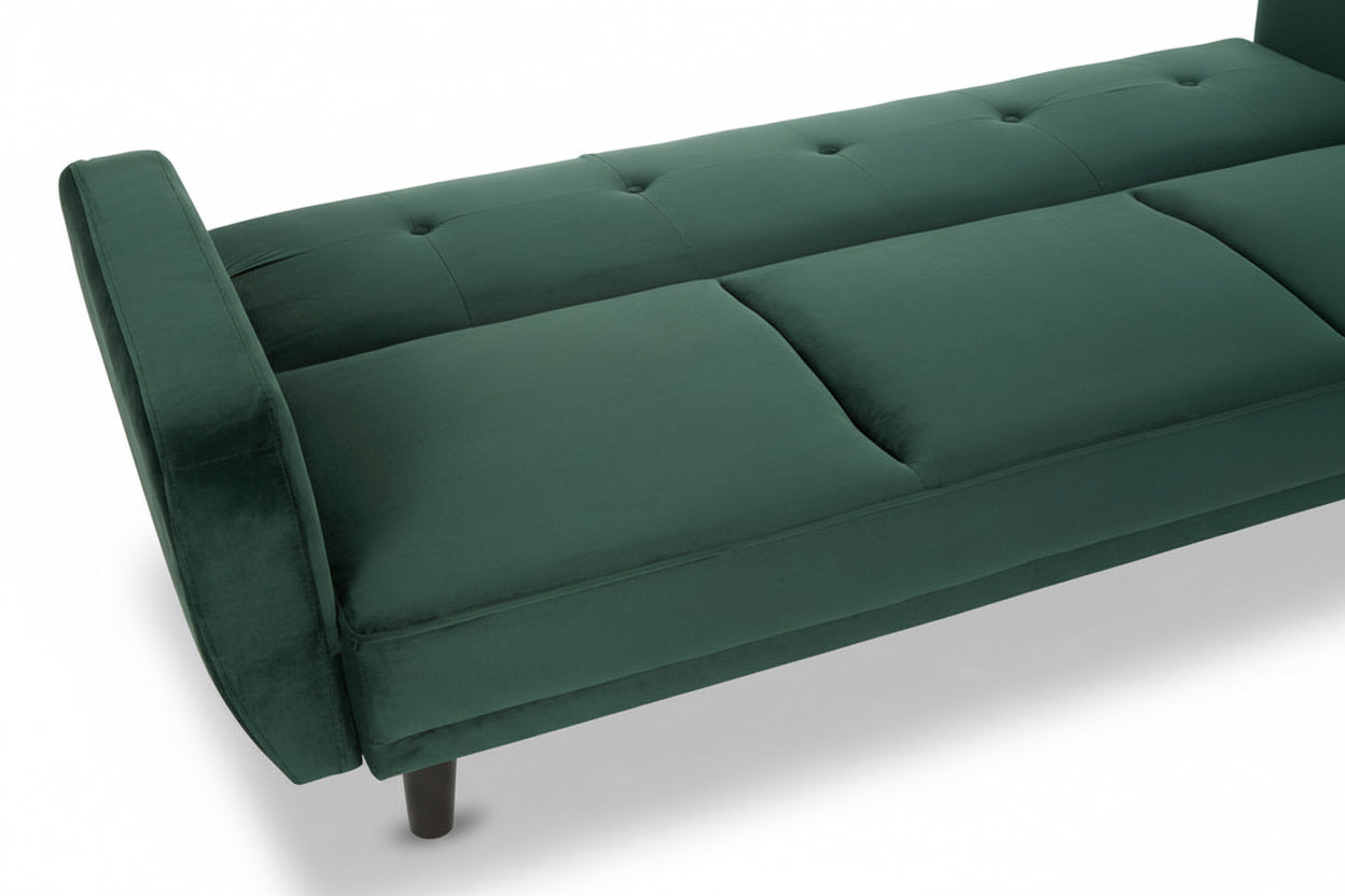 Create a striking centrepiece in your living space with the Sennels Green Velvet 3-Seater Sofa Bed—where contemporary design and luxurious comfort come together. Upholstered in rich green velvet, this sofa bed showcases clean lines, piped edging, and subtle button tufting that add a refined yet timeless touch. Crafted for both style and practicality, the backrest folds down smoothly to transform the sofa into a comfortable bed, making it perfect for overnight guests or relaxed lounging. The neatly angled natural rubberwood legs introduce warm contrast and a modern Scandinavian feel. A versatile, sophisticated addition to any modern home.