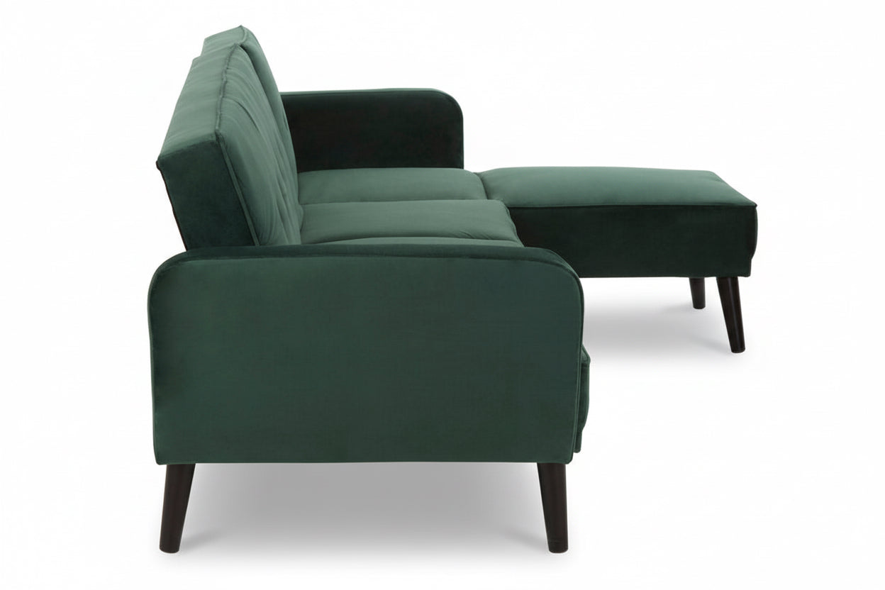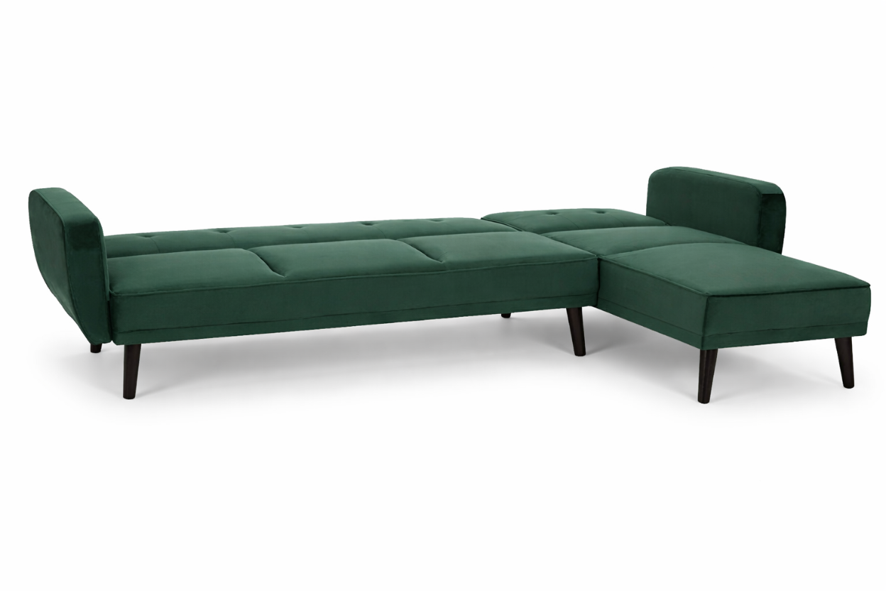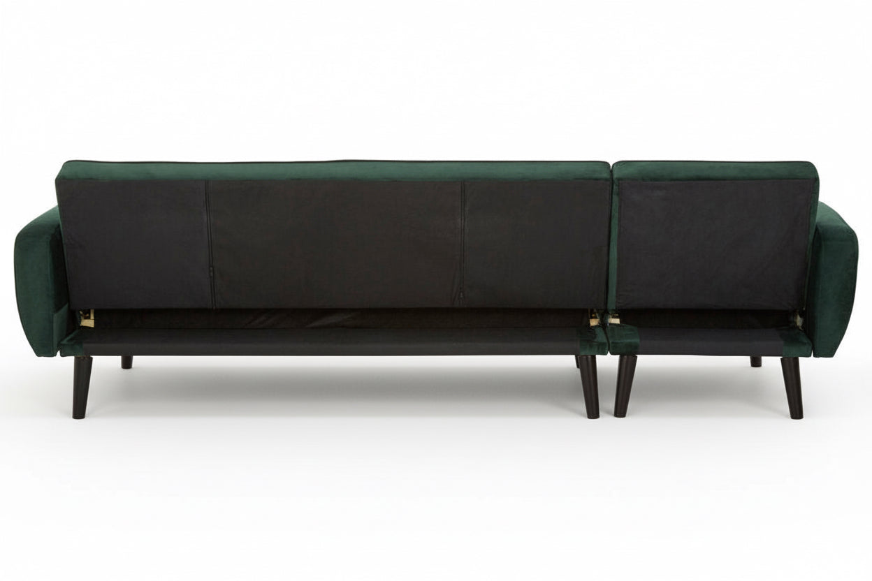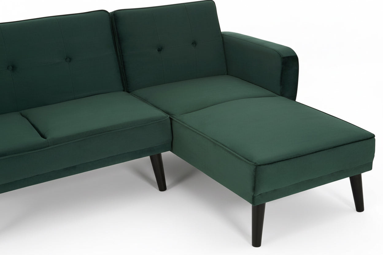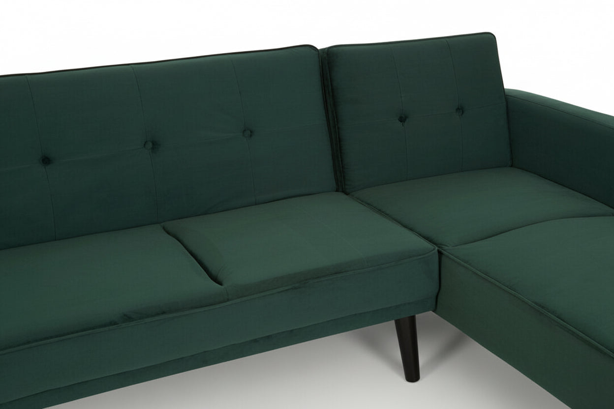 Create a striking centrepiece in your living space with the Sennels Green Velvet 3-Seater Sofa Bed—where contemporary design and luxurious comfort come together. Upholstered in rich green velvet, this sofa bed showcases clean lines, piped edging, and subtle button tufting that add a refined yet timeless touch. Crafted for both style and practicality, the backrest folds down smoothly to transform the sofa into a comfortable bed, making it perfect for overnight guests or relaxed lounging. The neatly angled natural rubberwood legs introduce warm contrast and a modern Scandinavian feel. A versatile, sophisticated addition to any modern home.