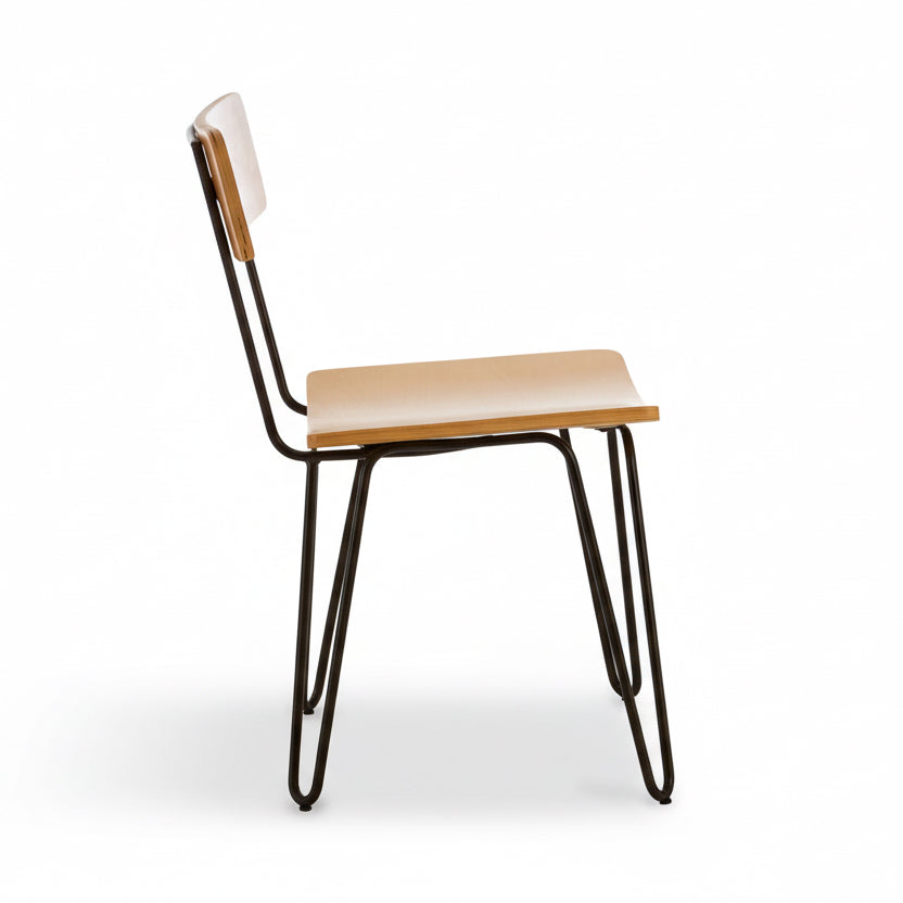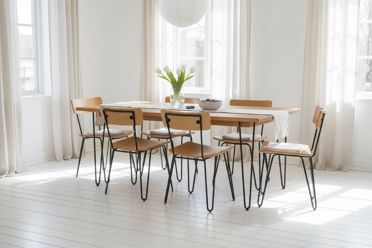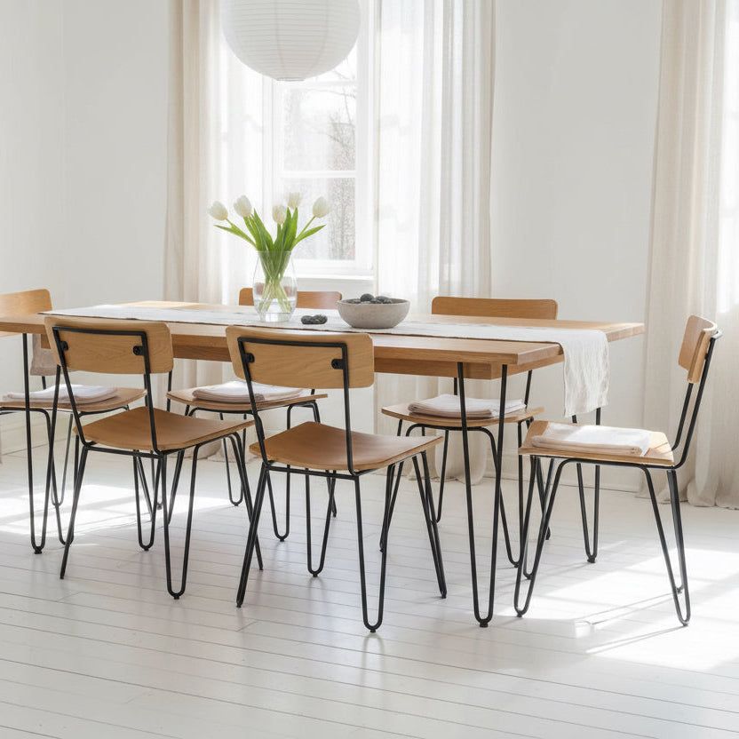 The Dronninglund Chair blends Scandinavian simplicity with a warm, modern boho edge. Its sleek black steel hairpin legs introduce a subtle vintage feel, while the softly curved wooden seat and backrest add a bright, contemporary contrast. Designed with angled construction for comfort and fitted with anti-skid tips for stability, it’s a stylish and practical accent piece for dining spaces, studios, or relaxed living areas. Clean lines, gentle colour, and timeless character—an easy way to elevate any room.