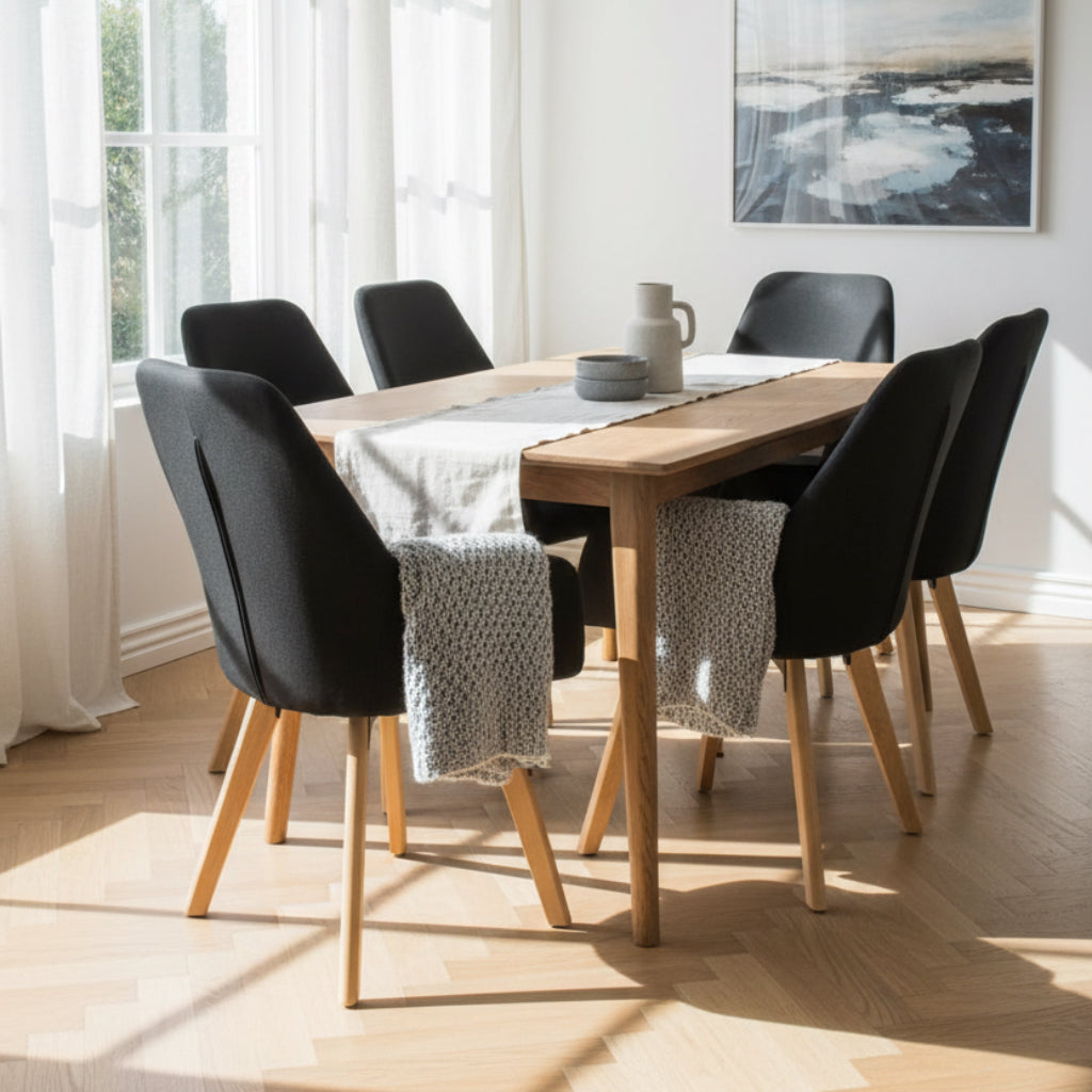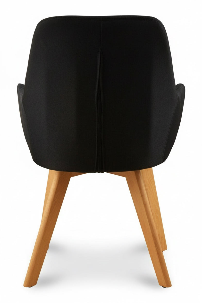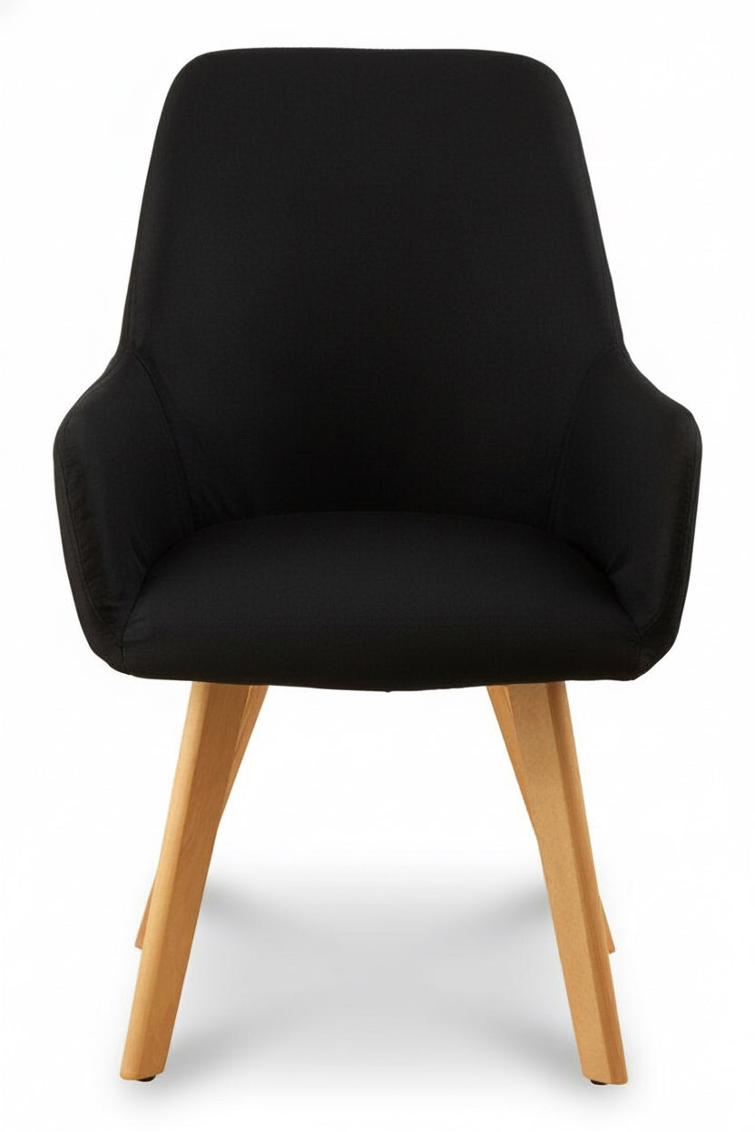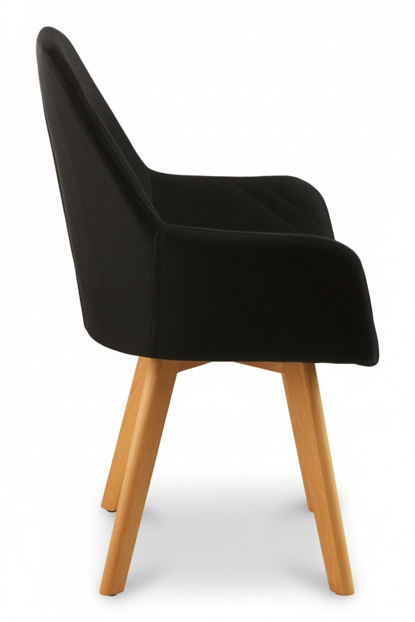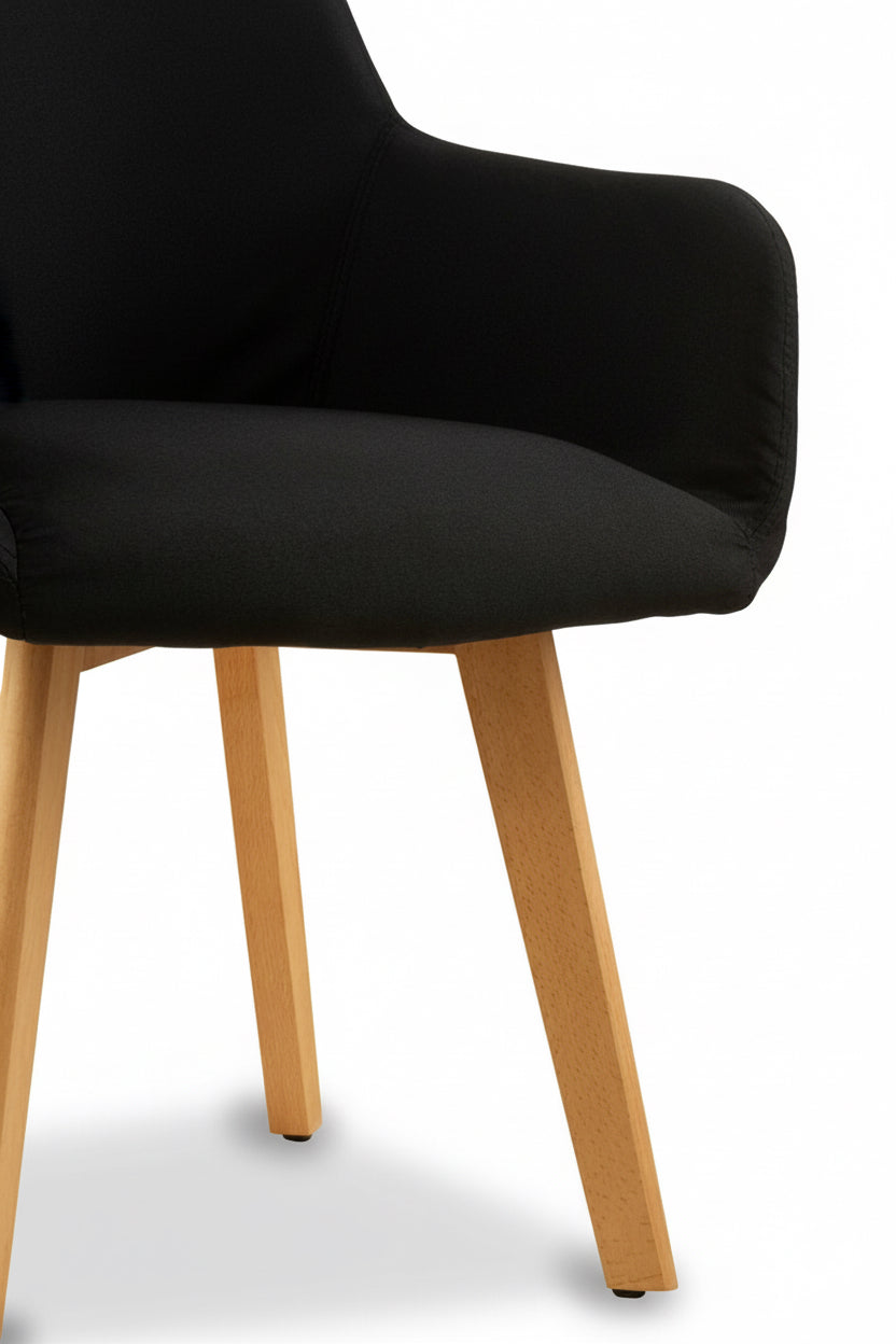The Storvorde Dining Armchair embodies refined Scandinavian design with its soft black fabric upholstery and natural beechwood legs. The gently angled backrest and raised armrests create a relaxed, comfortable seating experience, while the light wood grain adds warmth and balance. Finished with a clear lacquer for lasting elegance, this chair pairs beautifully with minimalist or modern dining spaces — a timeless statement of understated style.