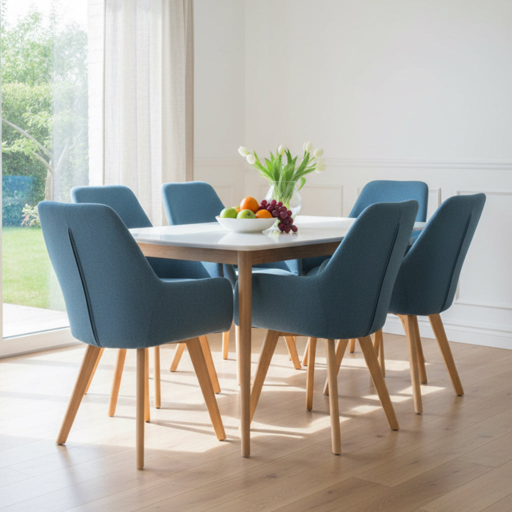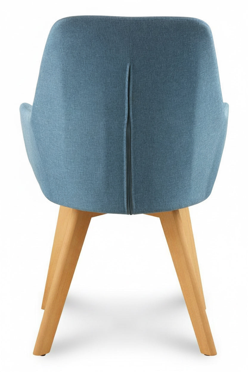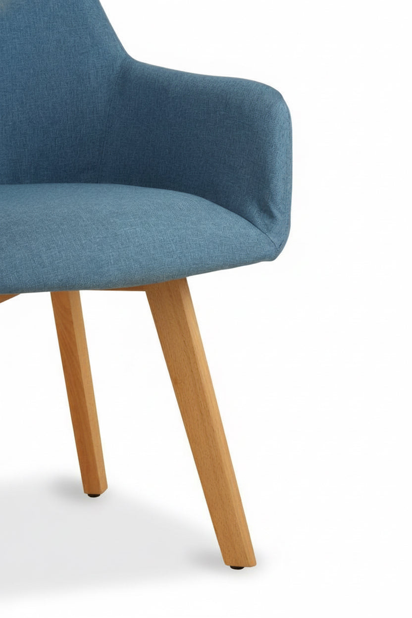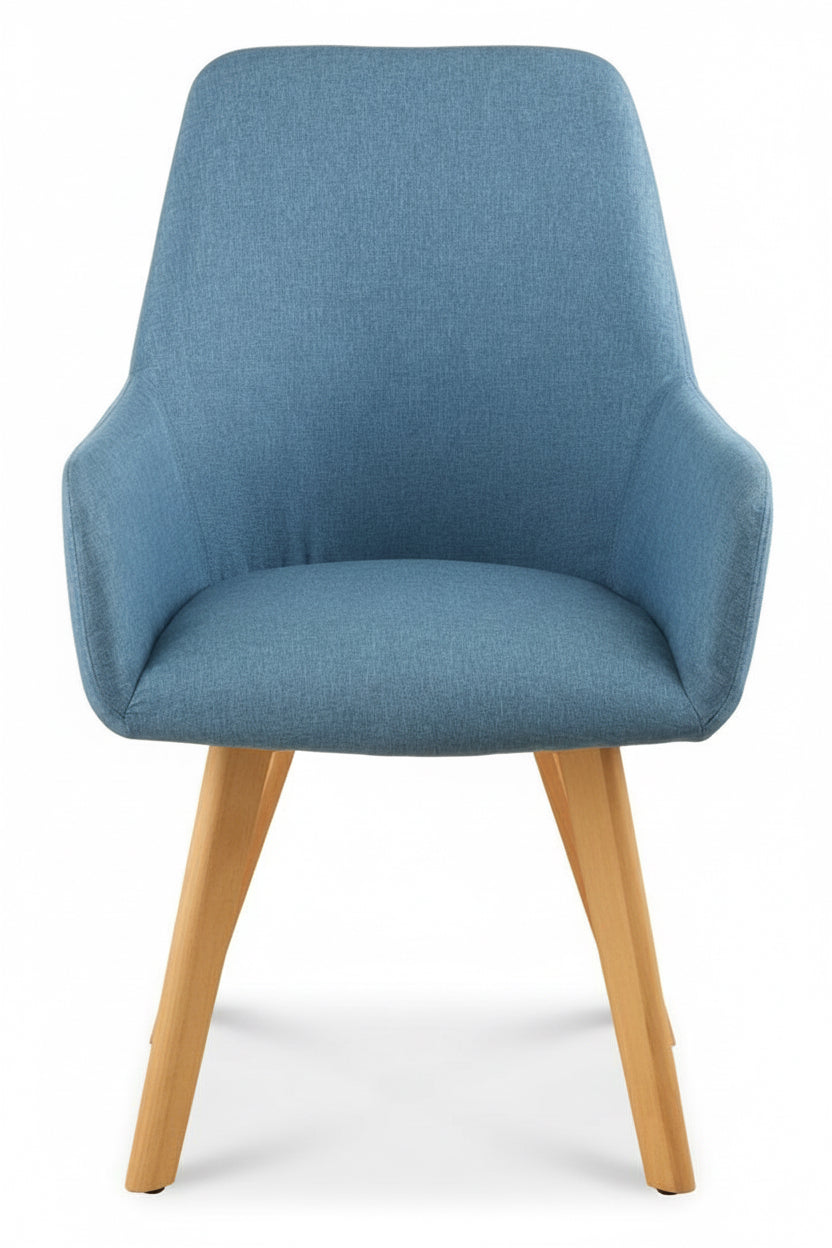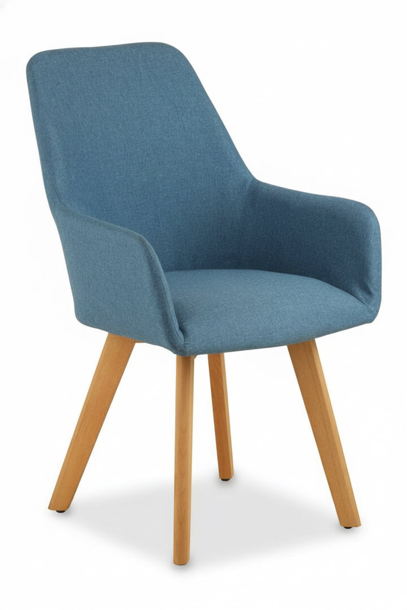 The Storvorde Dining Armchair embodies refined Scandinavian design with its soft blue fabric upholstery and natural beechwood legs. The gently angled backrest and raised armrests create a relaxed, comfortable seating experience, while the light wood grain adds warmth and balance. Finished with a clear lacquer for lasting elegance, this chair pairs beautifully with minimalist or modern dining spaces — a timeless statement of understated style.