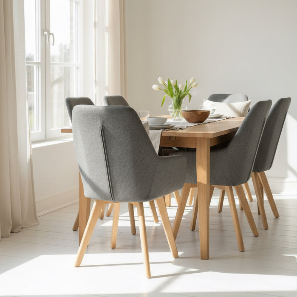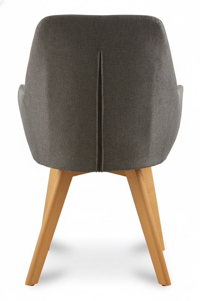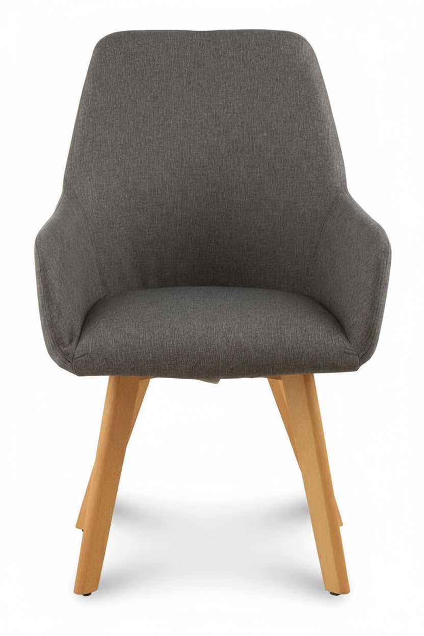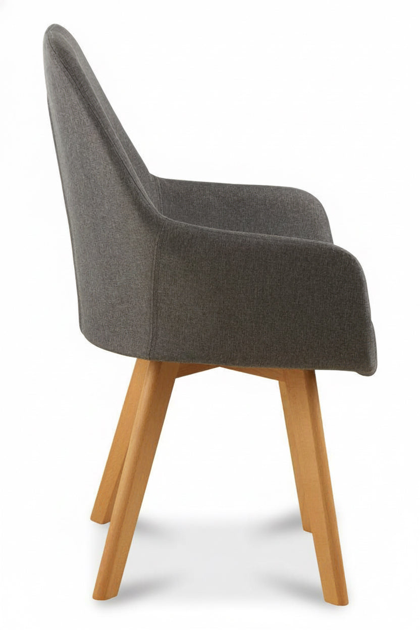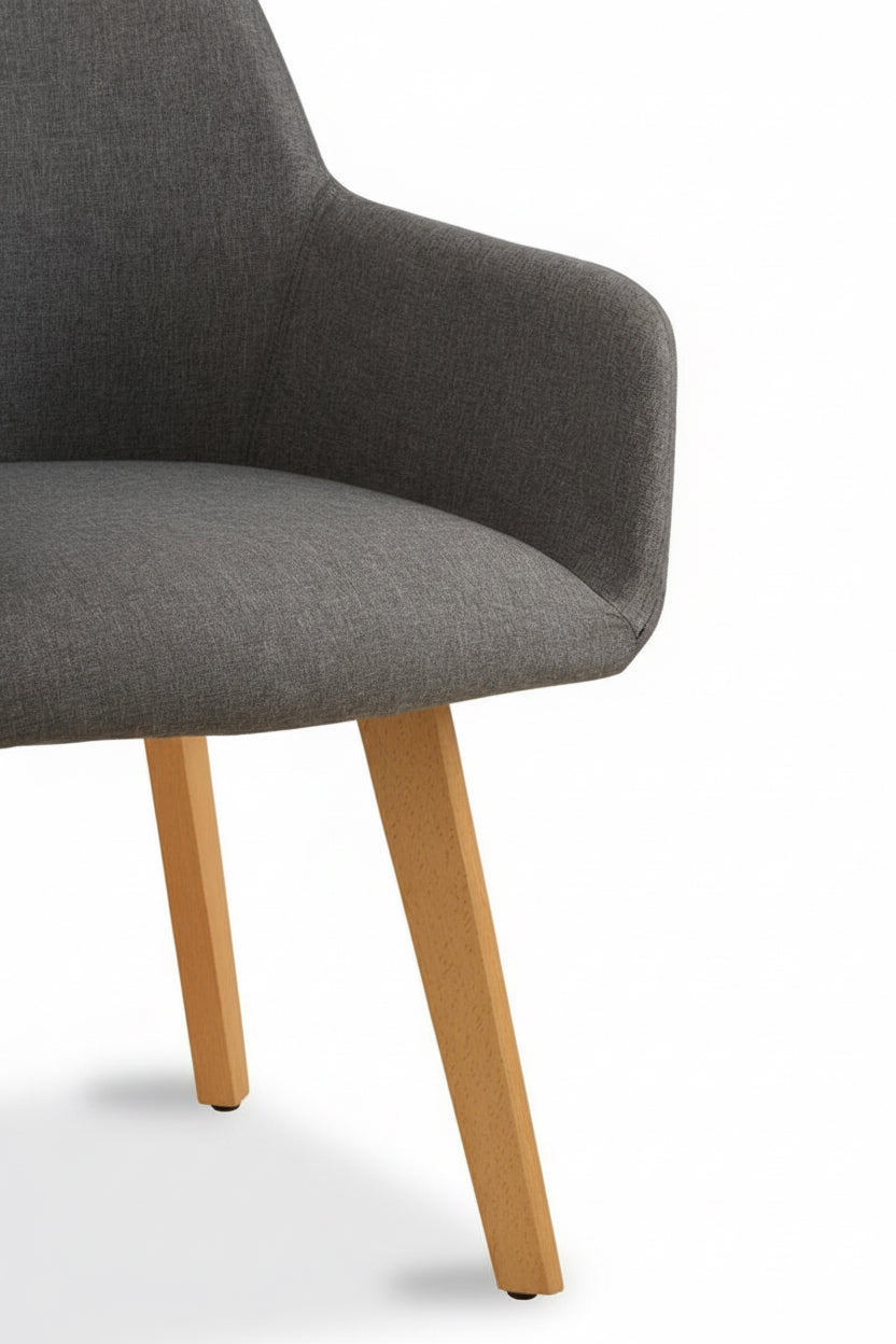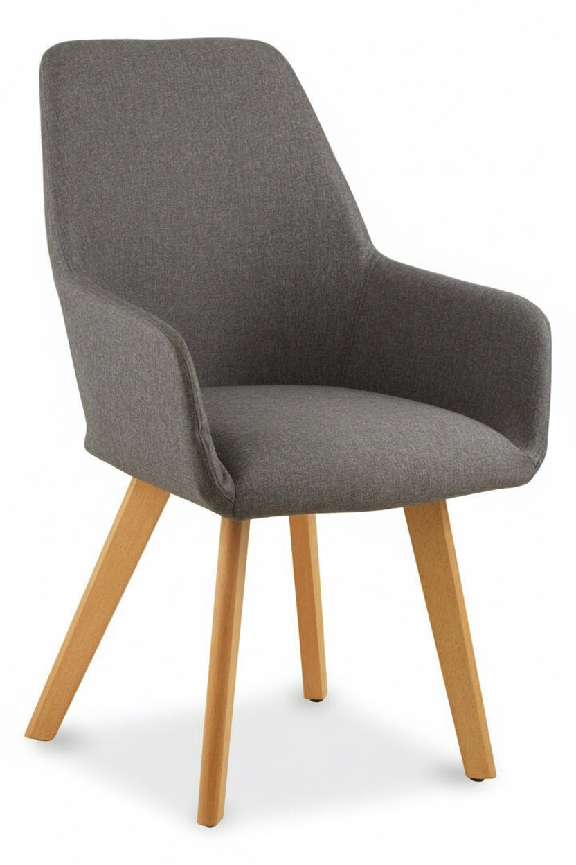 The Storvorde Dining Armchair embodies refined Scandinavian design with its soft grey fabric upholstery and natural beechwood legs. The gently angled backrest and raised armrests create a relaxed, comfortable seating experience, while the light wood grain adds warmth and balance. Finished with a clear lacquer for lasting elegance, this chair pairs beautifully with minimalist or modern dining spaces — a timeless statement of understated style.