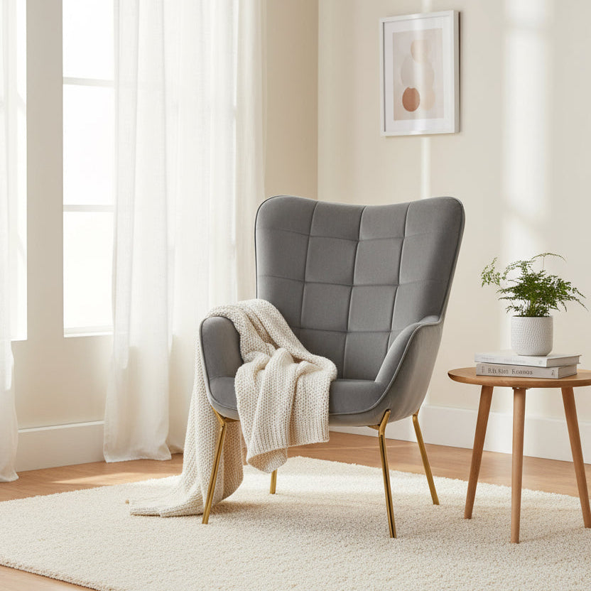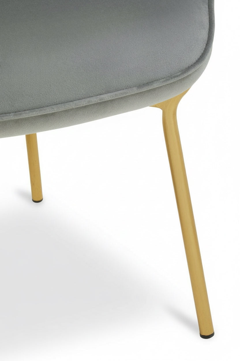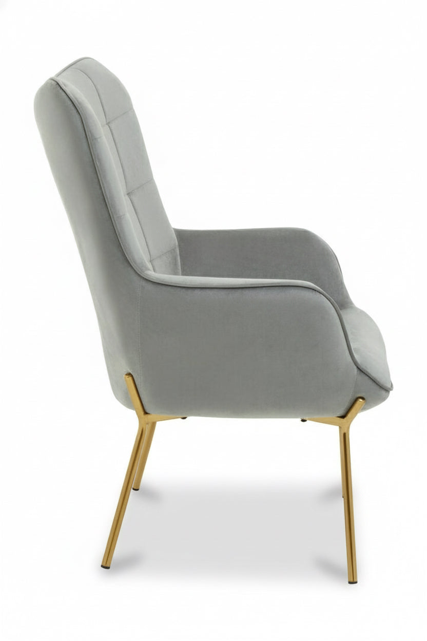 The Storvorde Lounge Chair brings together contemporary elegance and subtle opulence. Wrapped in soft grey velvet, its clean-lined stitching and square tufted backrest offer both style and support. The high-density foam seat ensures lasting comfort, while the sleek, tapered gold legs add a touch of modern glamour. A timeless statement piece that effortlessly elevates any living space.